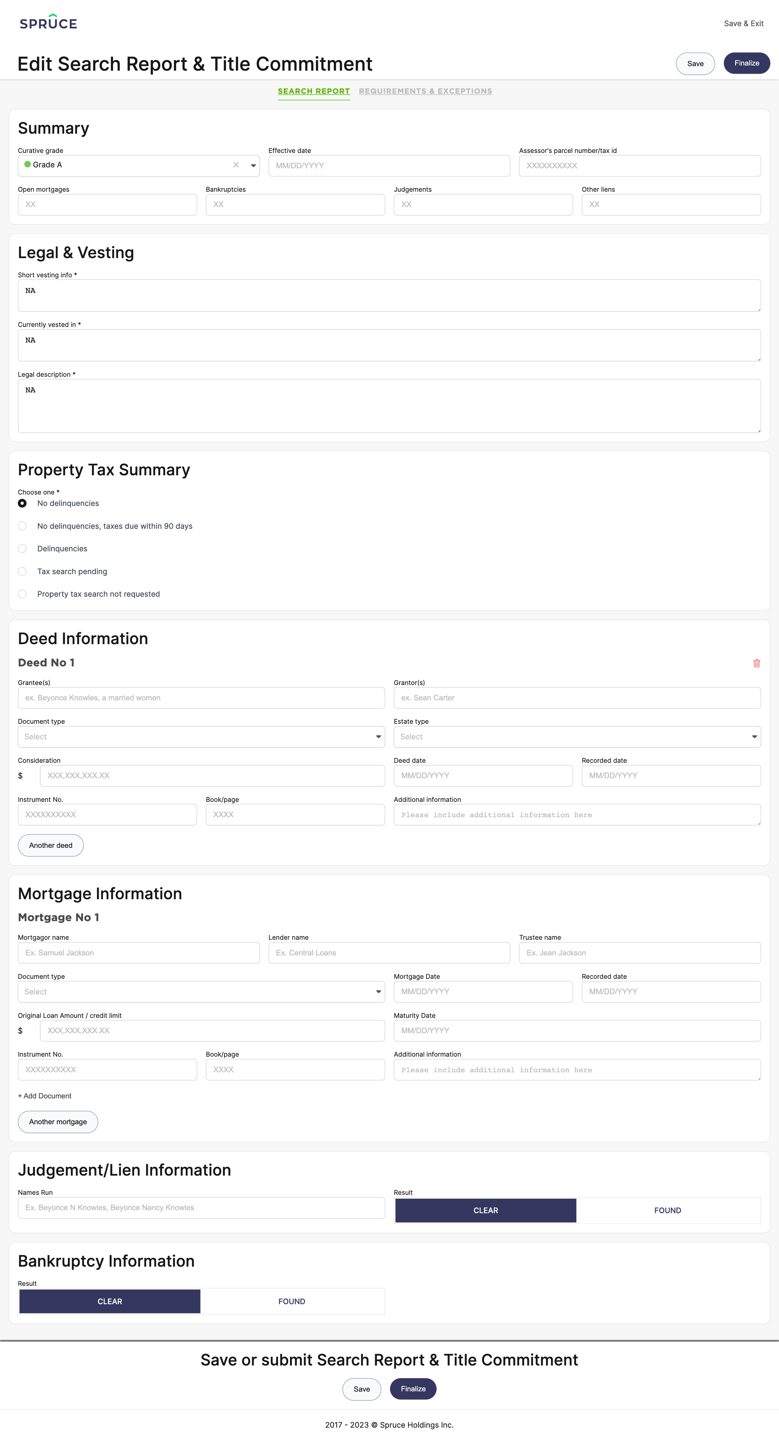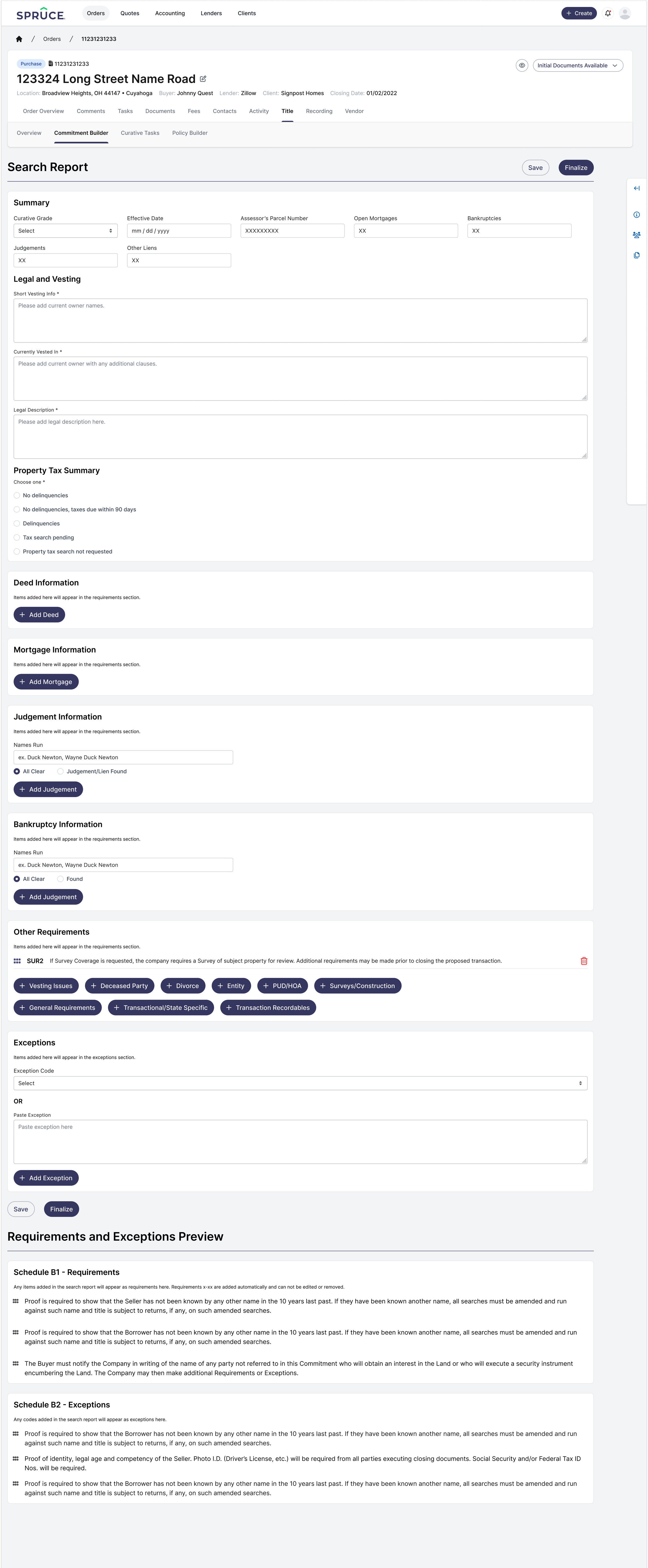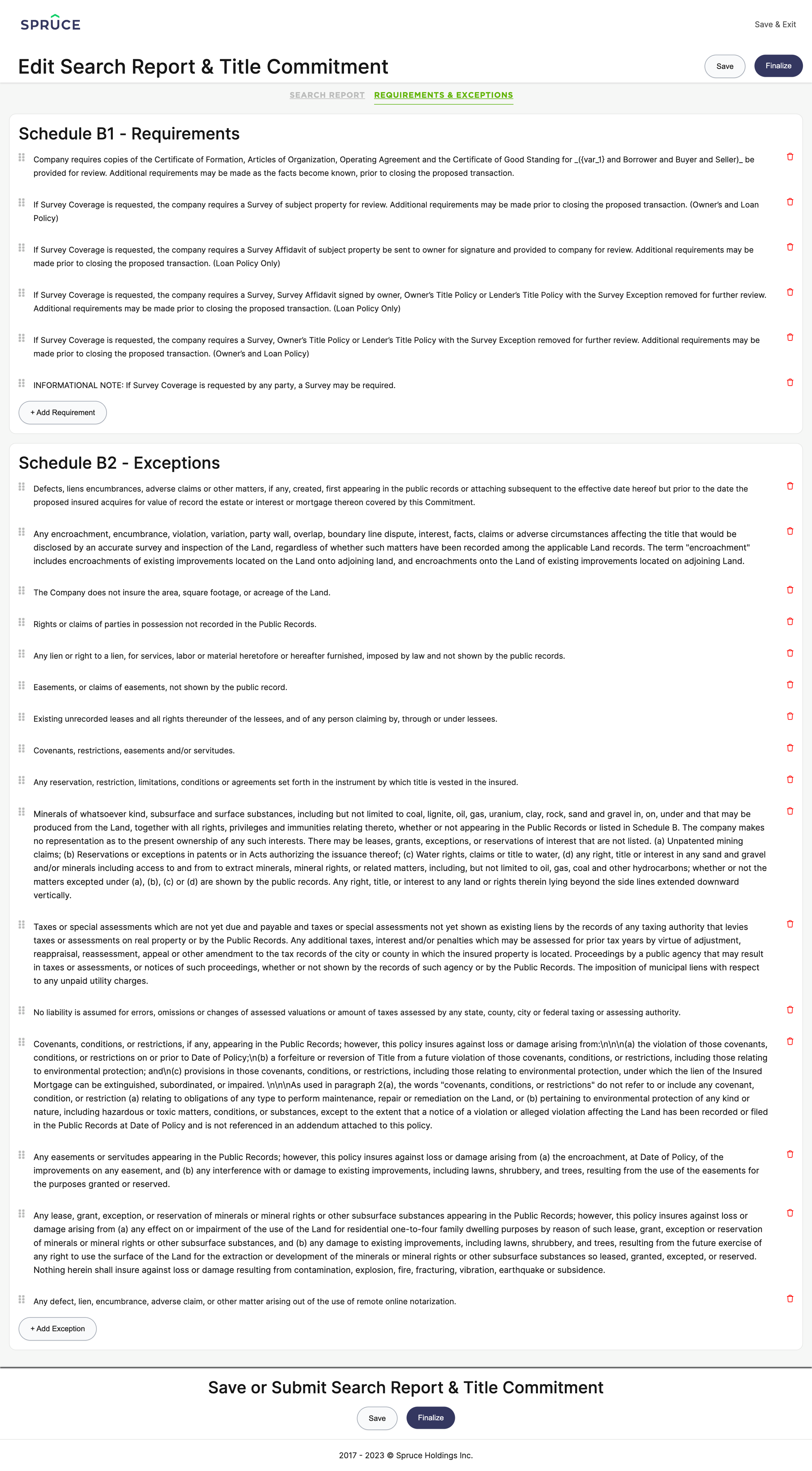 Duplicative Workflows: Building the title commitment requires duplicative efforts across the “Search Report” and “Requirements & Exceptions” tabs, creating inefficiencies and frustration for users.