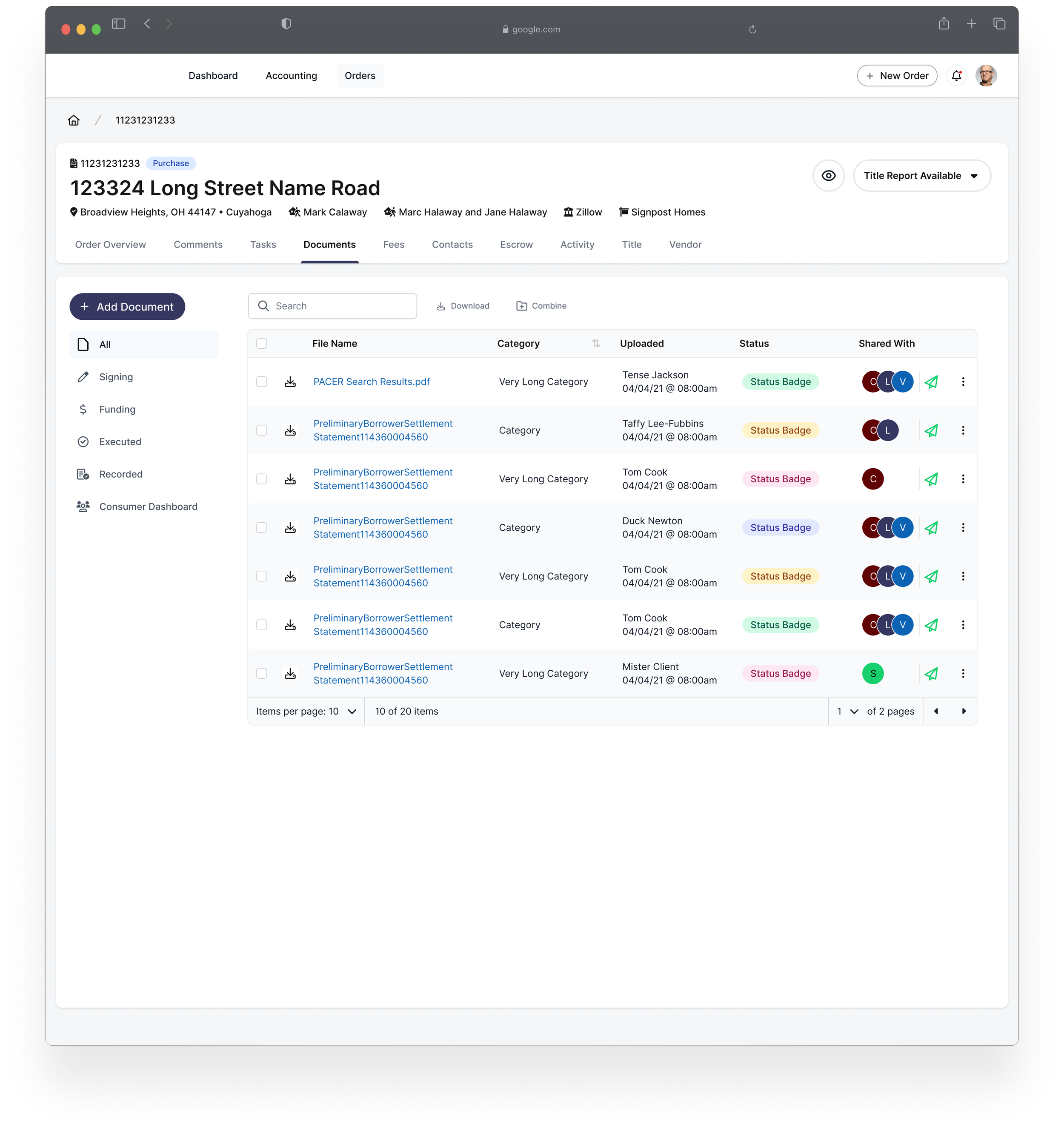 New Document Categories: Introduce clear categories for documents, including All, Signing, Executed, Funding, Recording, and Homeowner Portal, for better organization.